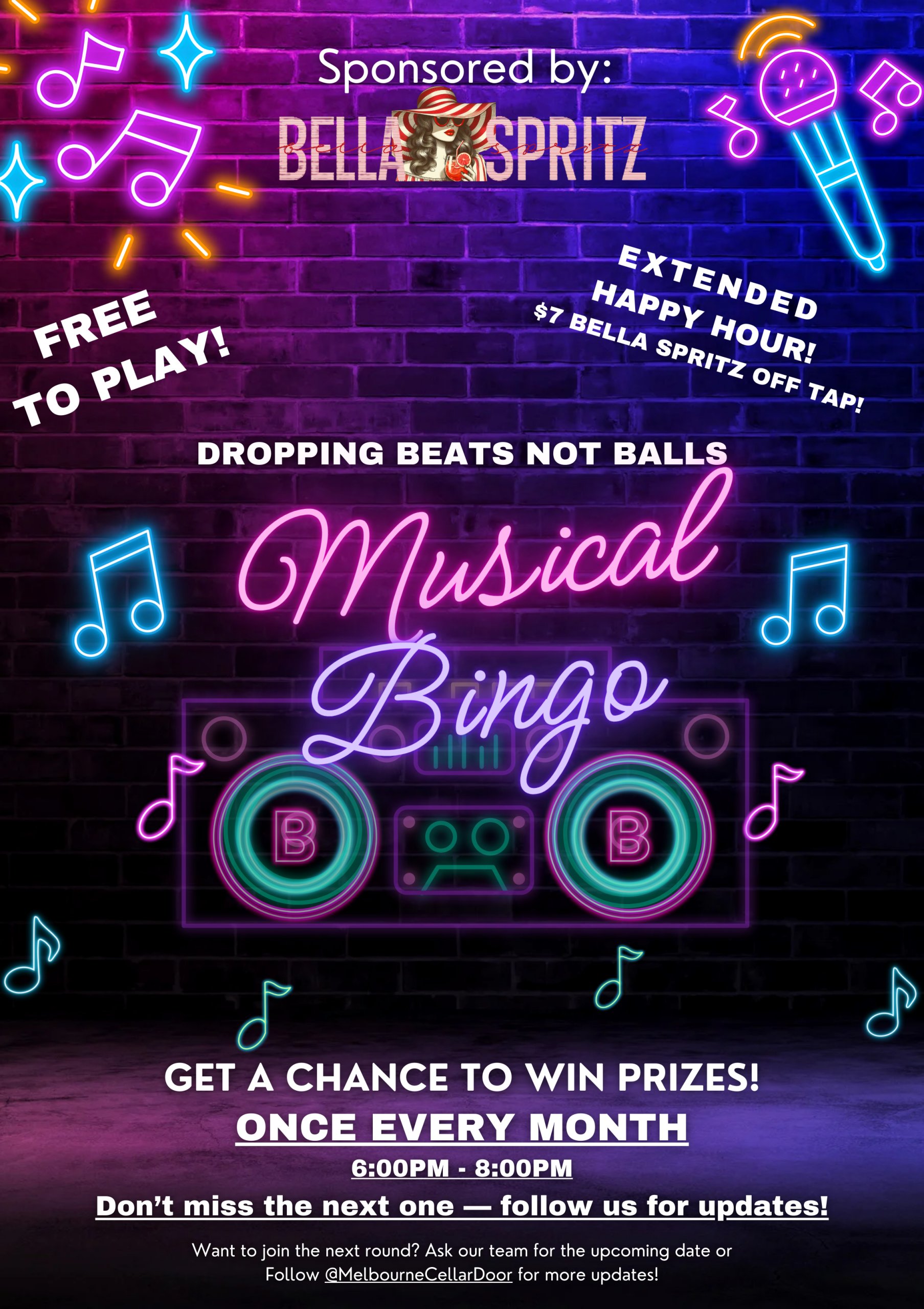 It’s free to play, packed with laughs, prizes to win, and of course an extended Happy Hour with $7 Bella Spritz on tap.